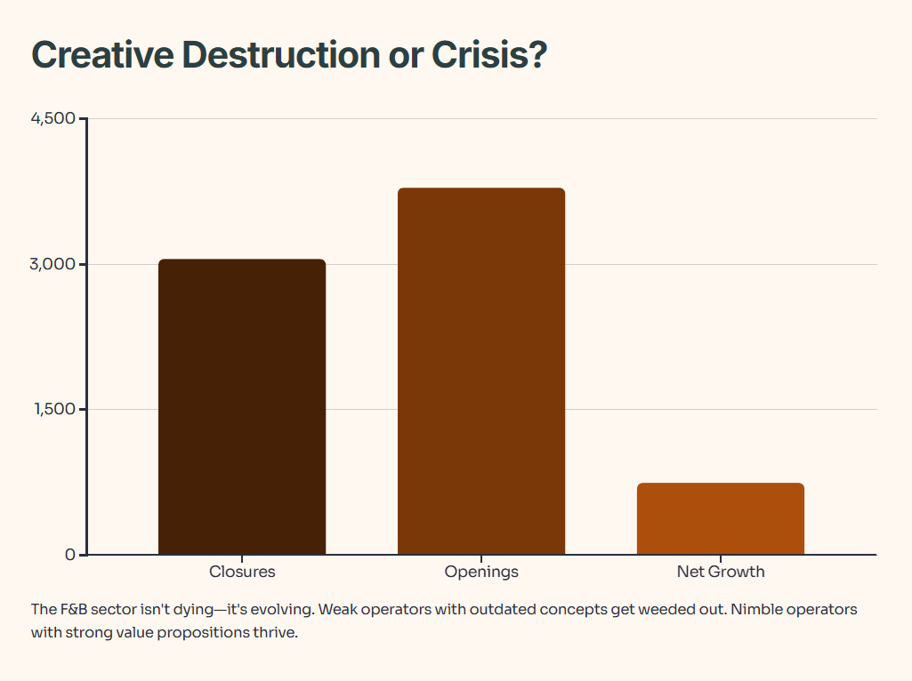 What This Means: The F&B sector isn’t dying. It’s evolving. Weak operators with outdated concepts, poor unit economics, and declining customer demand are getting weeded out. Nimble operators with strong value propositions, experiential dining, and efficient cost structures are thriving.