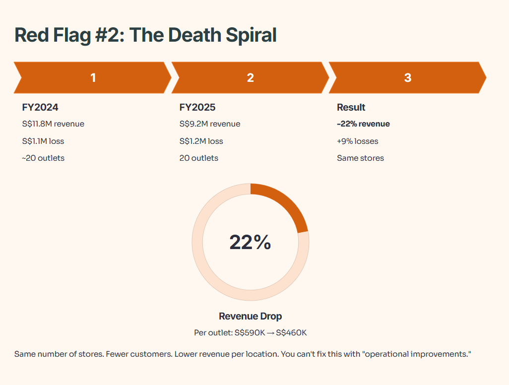 The outlet count stayed stable at around 20. So this wasn’t about overexpansion or closing underperforming stores. Revenue per outlet dropped 22%, from S$590,000 to S$460,000.