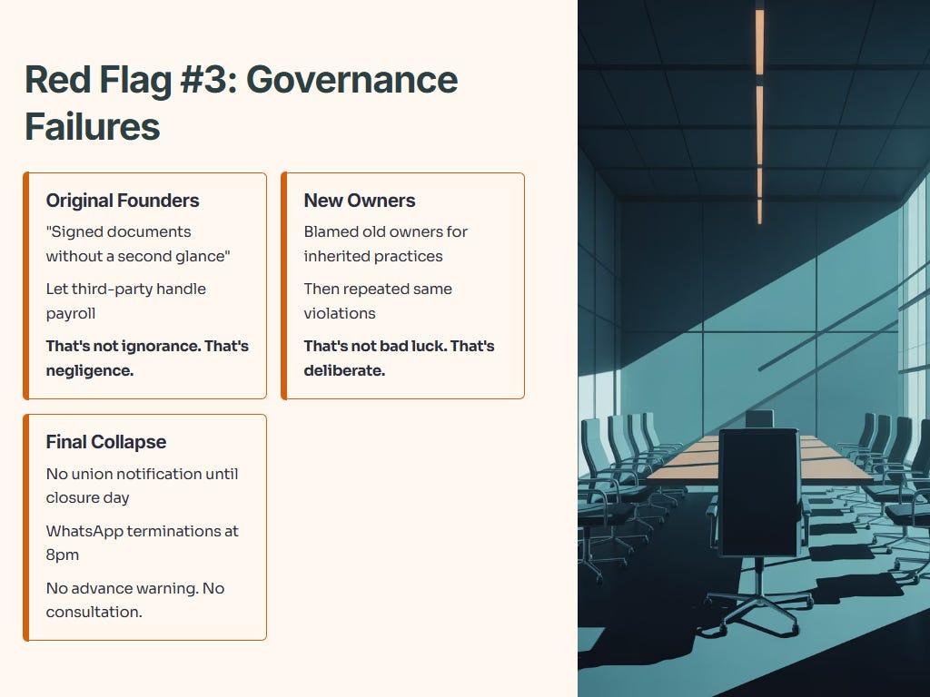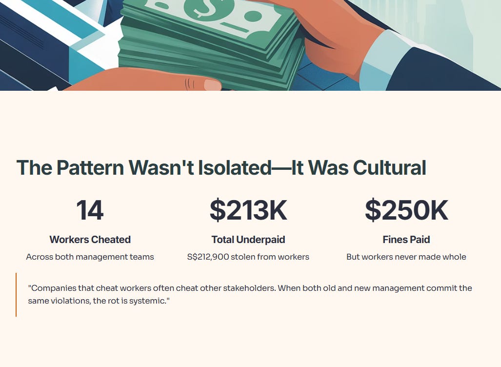Why This Matters for Investors: Labor violations aren’t just HR issues. They signal deeper problems. Companies that cheat workers often cheat other stakeholders. The pattern here wasn’t isolated misconduct—it was cultural. When both old and new management commit the same violations, the rot is systemic.
