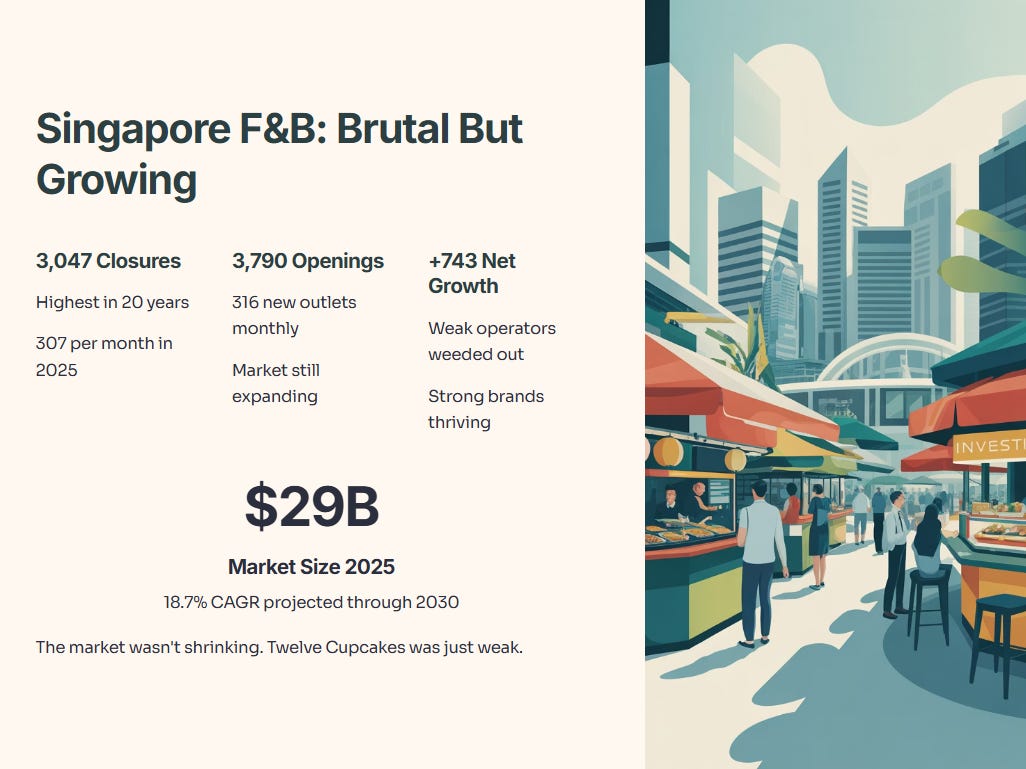 But context matters. Over 3,790 new F&B outlets opened in 2024, averaging 316 per month. The industry grew by 743 net new outlets. Singapore’s foodservice market is worth S$28.92 billion in 2025, with a projected CAGR of 18.7% through 2030.