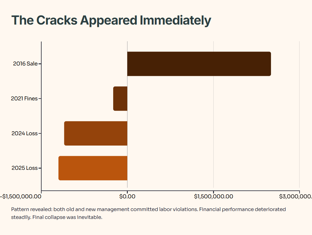 What This Table Shows: The timeline reveals a pattern. Both old and new management committed labor violations. Financial performance deteriorated steadily. The final collapse wasn’t sudden—it was the inevitable result of years of mismanagement and declining fundamentals.