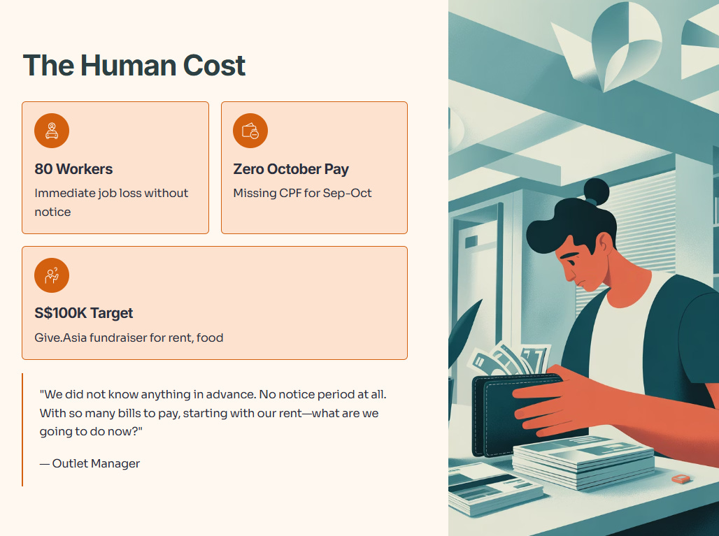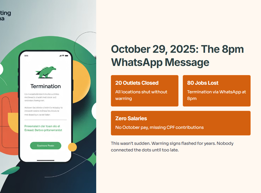On October 29, 2025, Twelve Cupcakes shut down all 20 outlets without warning. Eighty employees lost their jobs instantly. They received termination notices via WhatsApp at 8pm. No salaries for October. CPF contributions for September and October? Missing. The company entered provisional liquidation the same day.
