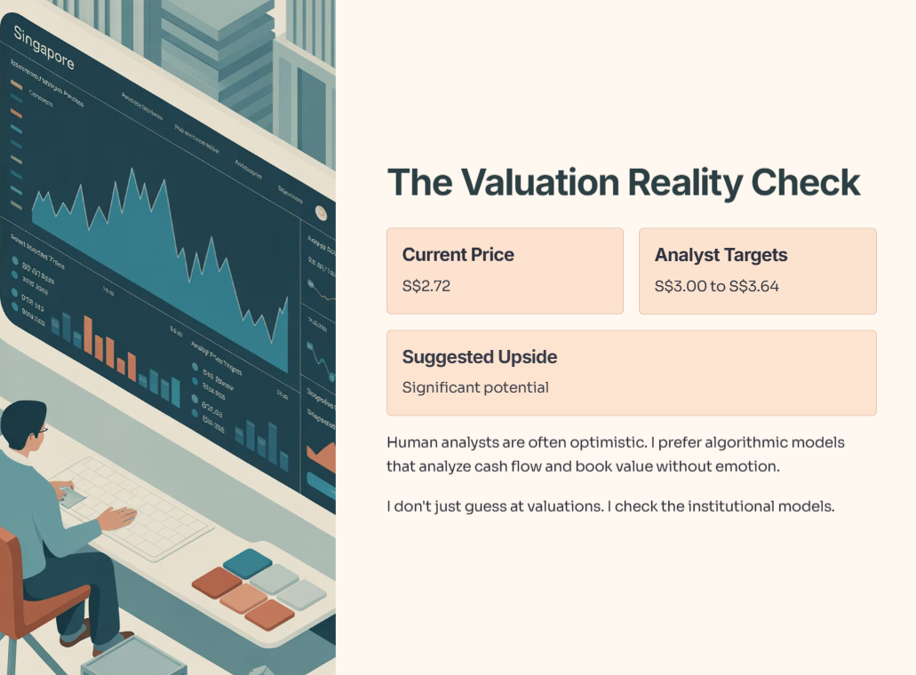 The stock is currently trading around S$2.72. Analyst consensus (human beings) have price targets ranging from S$3.00 to S$3.64, suggesting significant upside.