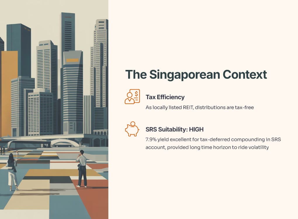 SRS Suitability: High. The 7.9% yield is excellent for tax-deferred compounding in an SRS account, provided you have a long time horizon to ride out volatility.