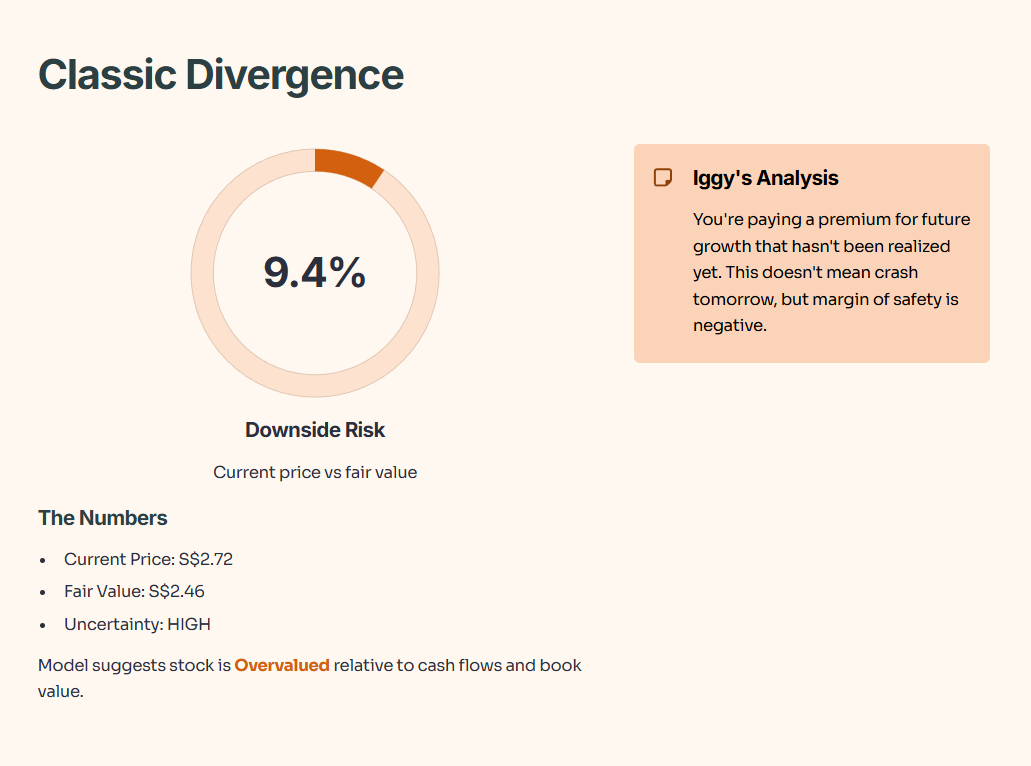 This is a classic “Divergence.” While the market sentiment is bullish, the InvestingPro Fair Value model pegs the intrinsic value at S$2.46.