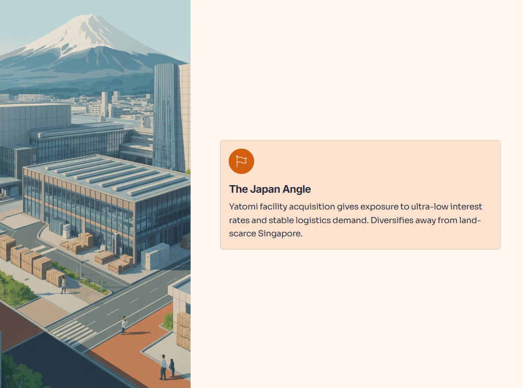 The acquisition of the Yatomi facility in Japan gives them exposure to a market with ultra-low interest rates and stable logistics demand. It diversifies them away from the land-scarce limitations of Singapore.