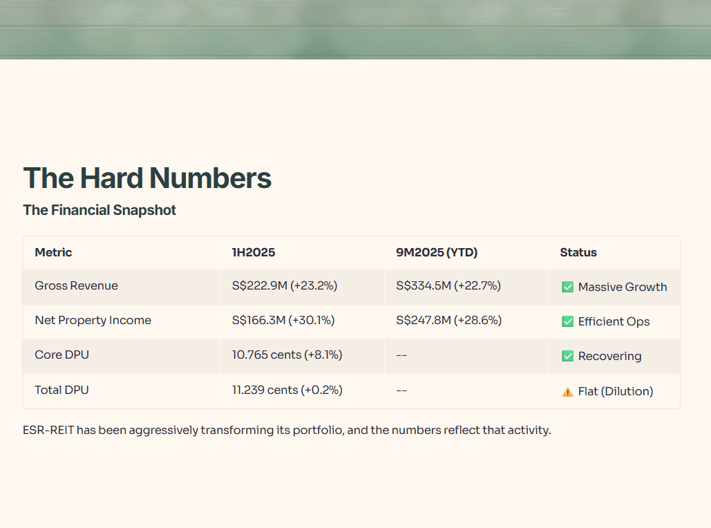 Let’s look at the engine room. ESR-REIT has been busy transforming its portfolio, and the 1H2025/9M2025 numbers reflect that aggressive activity.