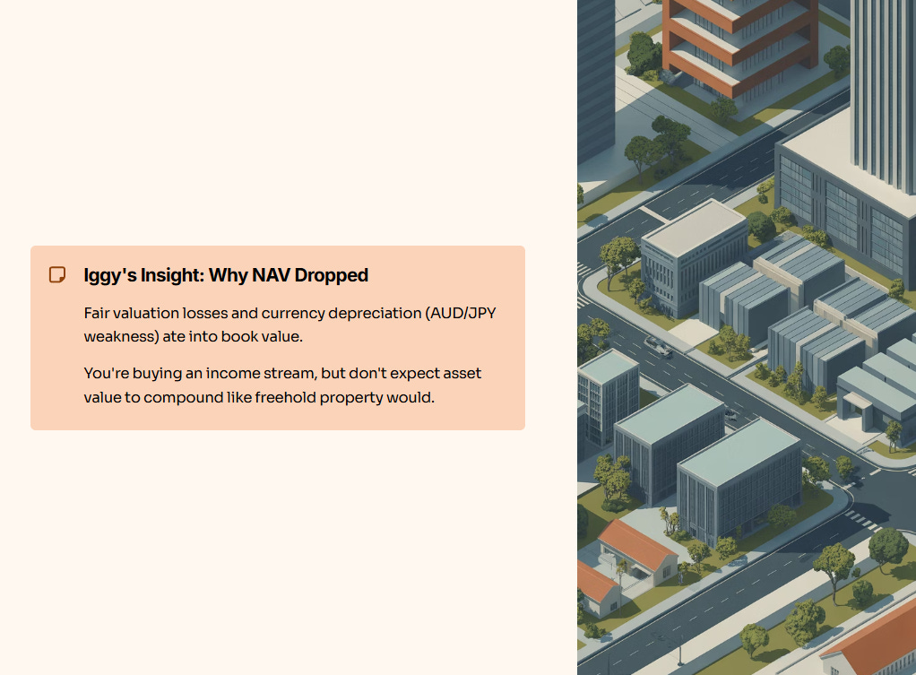 This is why the NAV dropped. Fair valuation losses and currency depreciation (AUD/JPY weakness) ate into the book value. You are buying an income stream, but don’t expect the asset value to compound like a freehold property would.
