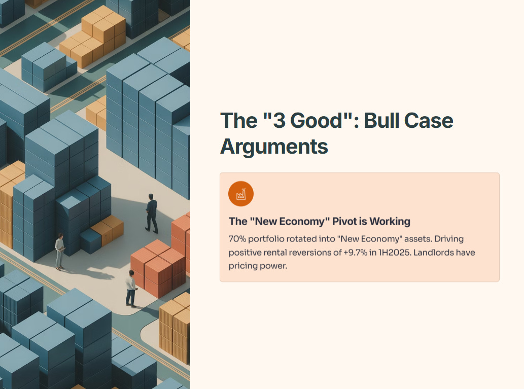 Old industrial factories are dying. Logistics and High-Specs buildings are booming. ESR-REIT has aggressively rotated 70% of its portfolio into “New Economy” assets. This is driving positive rental reversions of +9.7% in 1H2025. Landlords have pricing power here.