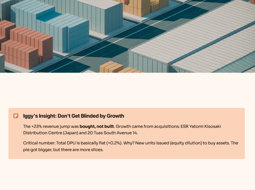 Don’t get blinded by the +23% revenue jump. That growth was bought, not just built. It comes from the acquisition of the ESR Yatomi Kisosaki Distribution Centre in Japan and 20 Tuas South Avenue 14. The critical number here is the Total DPU, which is basically flat (+0.2%). Why? Because they issued new units (equity dilution) to buy those assets. The pie got bigger, but there are more slices.