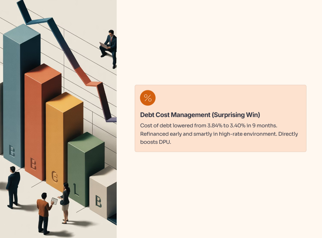 In a high-rate environment, most REITs are seeing interest costs explode. ESR-REIT actually lowered its cost of debt from 3.84% to 3.40% in just 9 months. They refinanced early and smartly. This directly boosts the DPU.