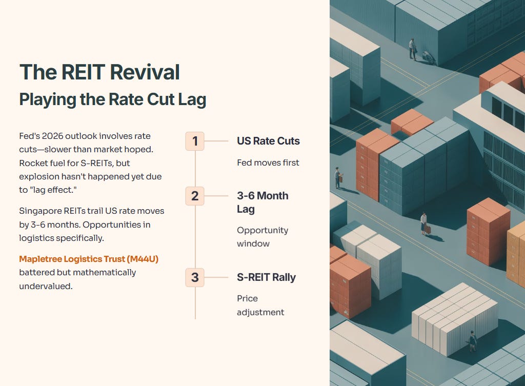 The Fed’s outlook for 2026 involves rate cuts, albeit slower than the market hoped. This is rocket fuel for S-REITs, but the explosion hasn’t happened yet because of the “lag effect.”