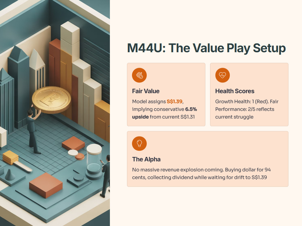 Here is the Alpha: The model hates the growth narrative here, and frankly, it’s right. There is no massive revenue explosion coming. We aren’t buying M44U for growth. We are buying it because it is trading below its intrinsic value (Fair Performance score of 2/5 reflects the current struggle). You are buying a dollar for 94 cents, collecting the dividend while you wait for the unit price to drift back up to that S$1.39 fair value anchor.