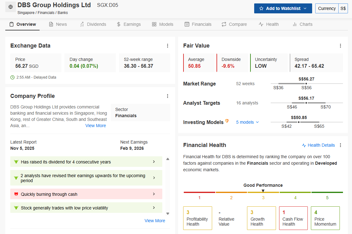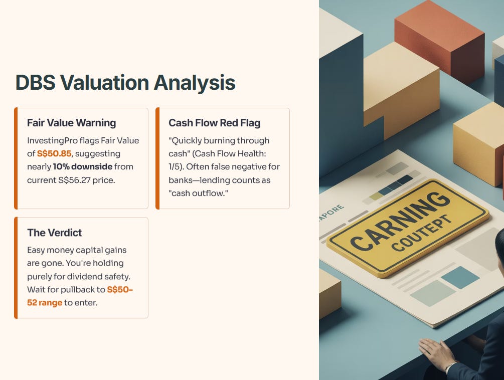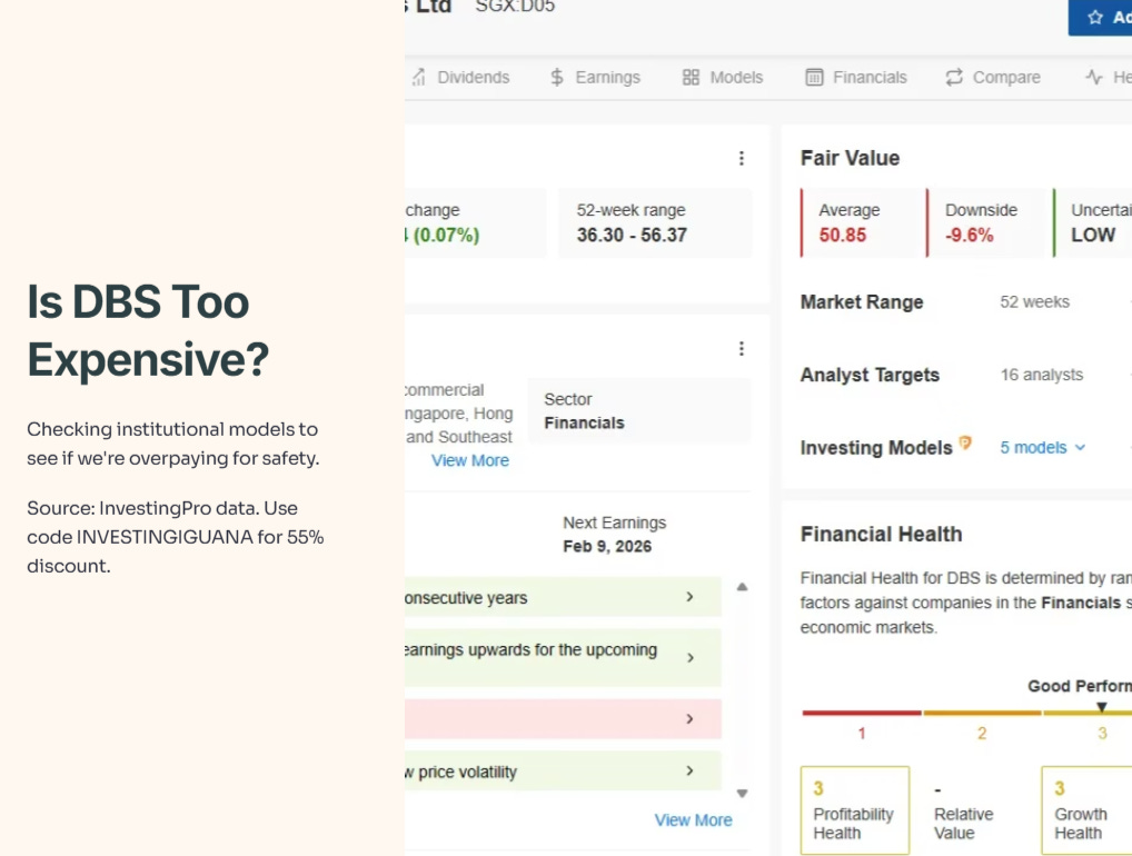 Iggy’s Analysis: The models are flashing yellow. InvestingPro flags a Fair Value of S$50.85, suggesting nearly 10% downside from the current S$56.27 price.