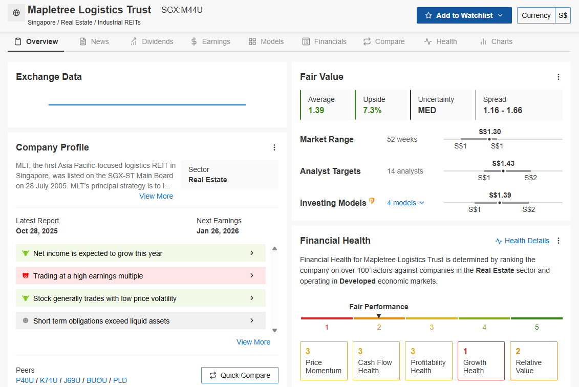 Iggy’s Analysis: This is a classic “Value Play” setup. The model assigns M44U a Fair Value of S$1.39, implying a conservative 6.5% upside from the current S$1.31 level.
