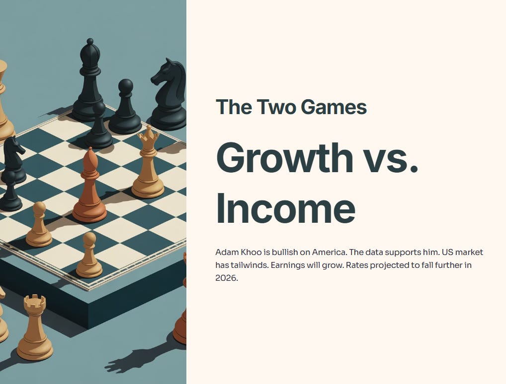 We need to address the elephant in the room. Adam Khoo is bullish on America, and the data supports him. The US market has tailwinds. Earnings will grow. Rates are projected to fall further in 2026. Single-digit returns are still returns.