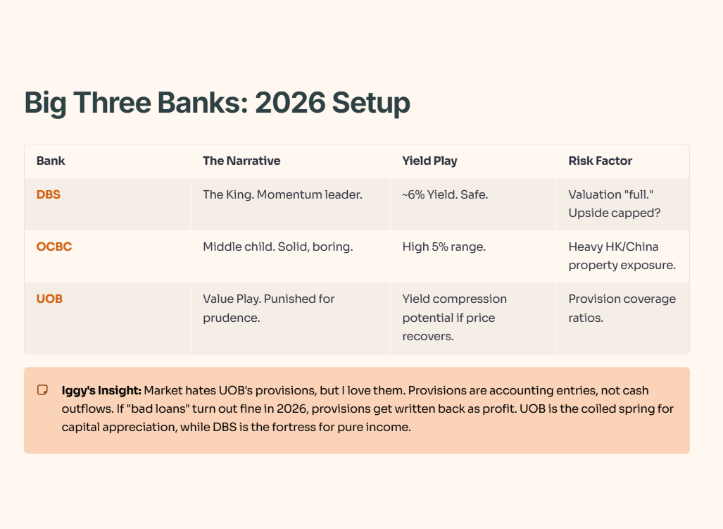 Iggy’s Insight: The market hates UOB’s provisions, but I love them. Why? Because provisions are accounting entries, not cash outflows. If those “bad loans” turn out to be fine in 2026, those provisions get written back as profit. UOB is the coiled spring here for capital appreciation, while DBS is the fortress for pure income.