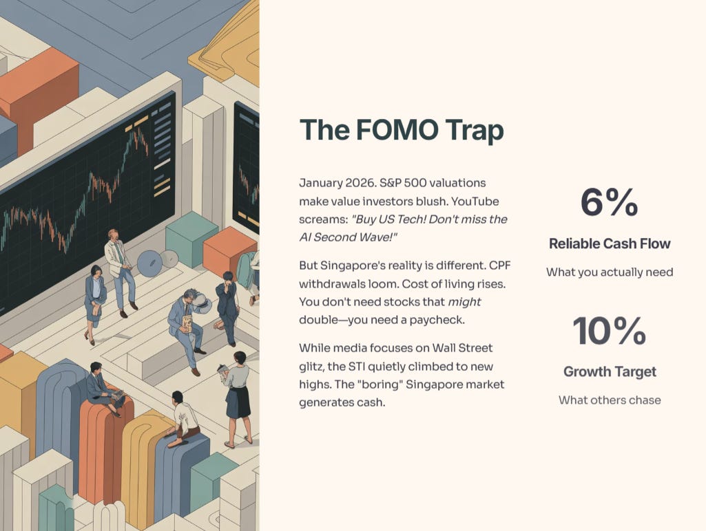 But let’s look at the reality of the Singaporean wallet. The cost of living in Singapore isn’t getting cheaper. Your CPF withdrawals are looming. You don’t need a stock that might double in five years but could drop 30% tomorrow. You need a paycheck.