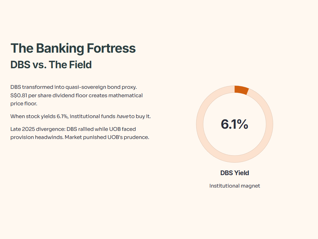 DBS has effectively transformed into a quasi-sovereign bond proxy. The commitment to the S$0.81 per share dividend floor (implied annualized) creates a mathematical floor for the stock price. When a stock yields 6.1%, institutional funds have to buy it.
