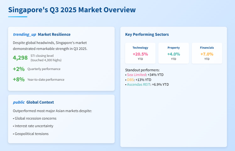 Another quarter wrapped up. If you're like most Singaporean investors, you’re looking at recent headlines and wondering what’s really going on. Globally, recession talk lingers, interest rates are still uncertain, and geopolitics is tense. Yet, on our little red dot, the Q3 2025 market tells a different, resilient story—or so it seems at first glance.