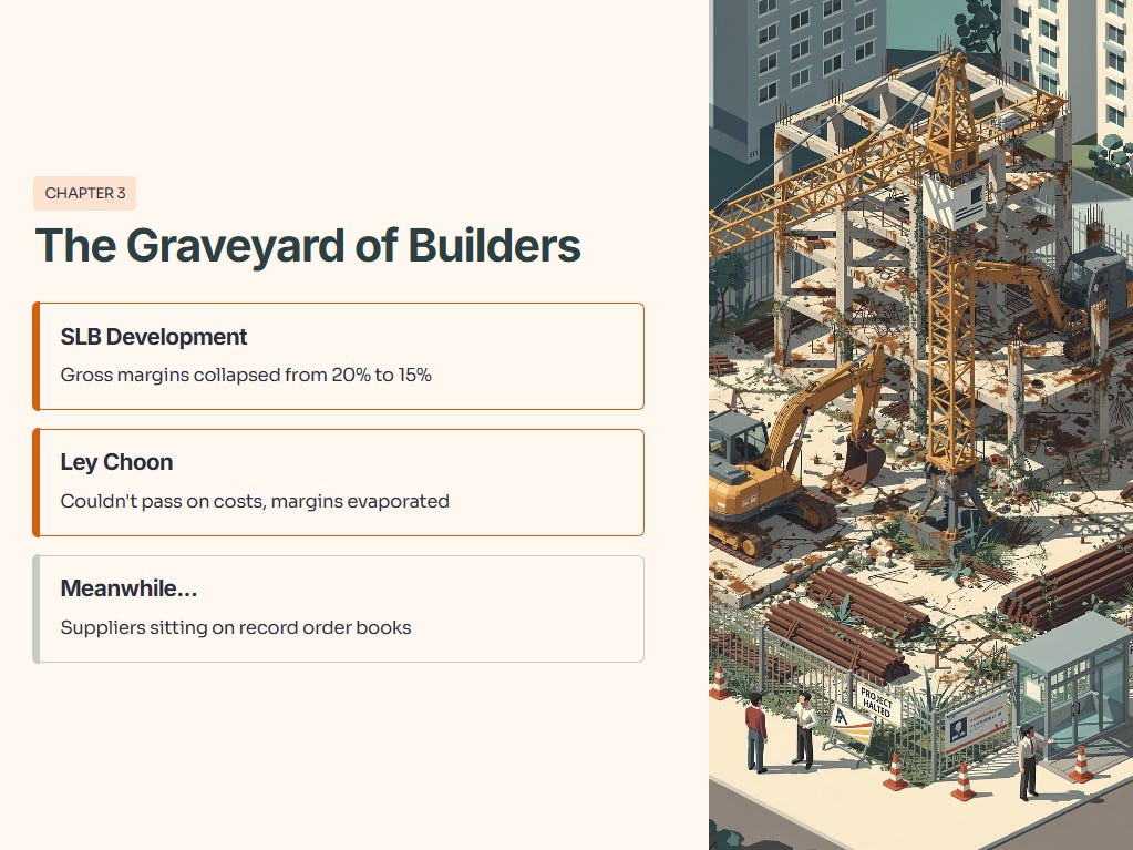 The market has punished the builders for a reason. Look at the “Graveyard” of firms like SLB Development or Ley Choon. Their gross margins fell from 20% to nearly 15% because they couldn’t pass on costs. Meanwhile, the suppliers are sitting on record order books.