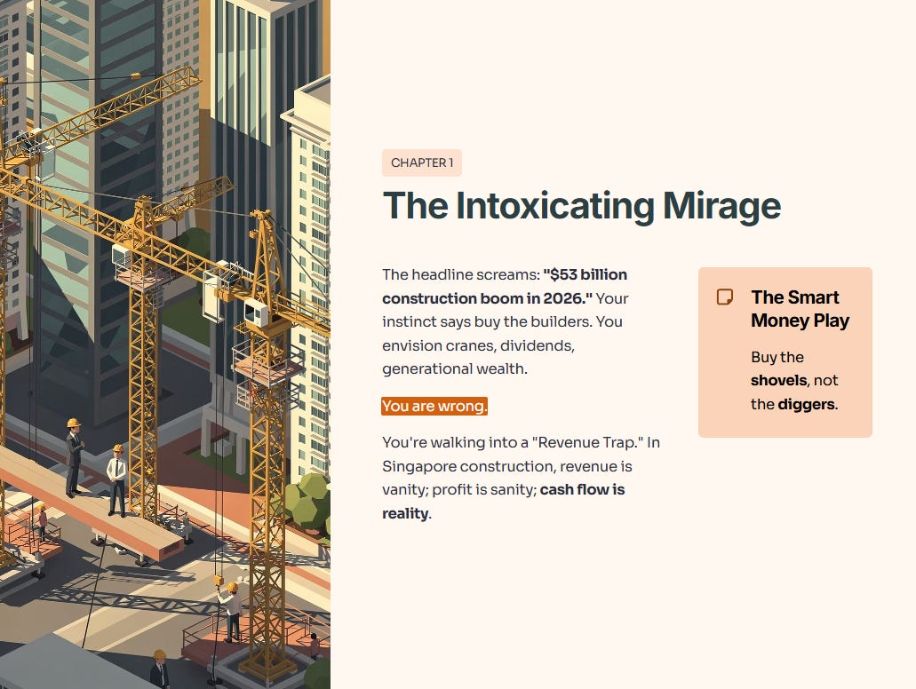You are wrong. In fact, you are walking straight into a “Revenue Trap.” In the Singapore construction sector, revenue is a vanity metric; profit is sanity, but cash flow is reality. If you buy the main contractors, you aren’t buying growth; you’re buying a 3% margin business with 100% of the execution risk. Let’s look at why the smart money is buying the shovels, not the diggers.
