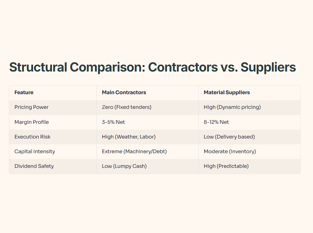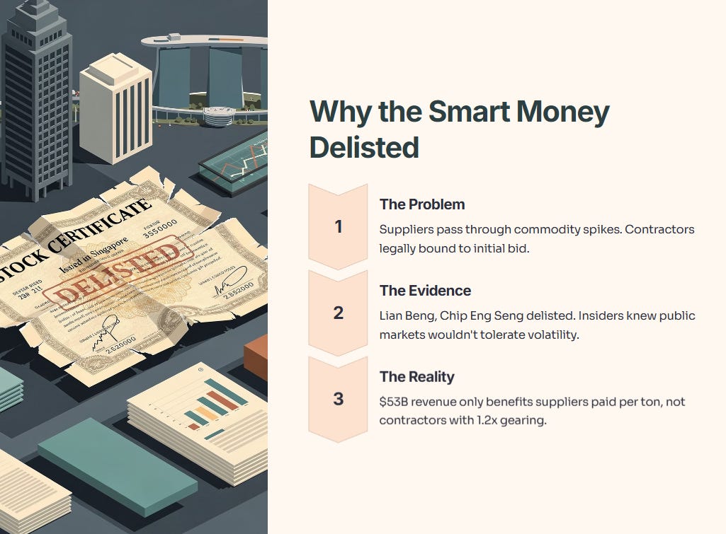 Analysing the “Why”: The table above highlights the fundamental divergence in business models. Main contractors operate on a “hope and pray” model where one site delay can wipe out years of profit. Notice the “Pricing Power” row: suppliers can pass through commodity spikes, whereas contractors are legally bound to their initial bid. This is why the Smart Money delisted Lian Beng and Chip Eng Seng; they knew public markets would never tolerate the volatility of fixed-price tender failures. For 2026, the $53B revenue figure only benefits the suppliers who get paid per ton delivered, not the contractors struggling with 1.2x gearing.