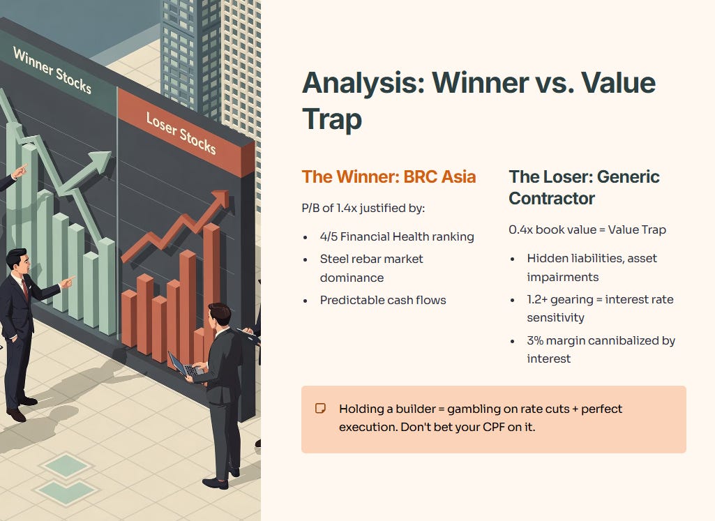 The winner is undeniably BRC Asia. While the P/B ratio of 1.4x suggests it’s “more expensive” than a generic contractor trading at 0.4x book value, the latter is a Value Trap. A contractor trading at 0.4x book reflects the market’s fear of hidden liabilities and asset impairments. BRC Asia’s higher valuation is justified by its “Great Performance” ranking (4/5) in Financial Health and its dominance in the steel rebar market.