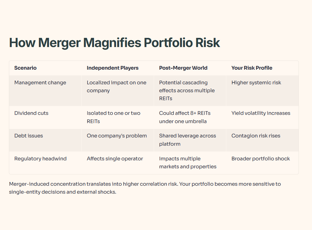 The question becomes: If one merged entity stumbles—bad acquisition, management turnover, regulatory issues—how many of your properties are affected? Answer: all of them.