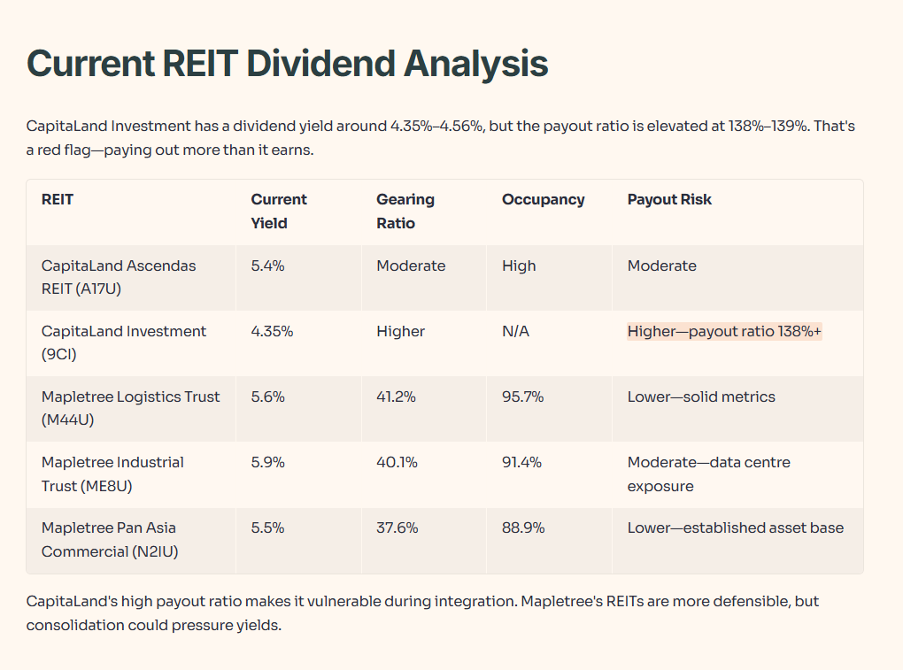The table reveals a key insight: CapitaLand Investment’s high payout ratio makes it vulnerable during integration turbulence. Mapletree’s REITs are more defensible, but consolidation could pressure their yields if the merged entity prioritizes debt reduction or capital recycling over distributions.
