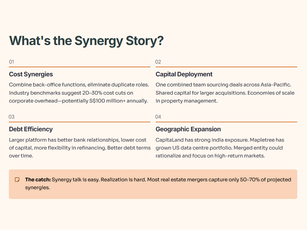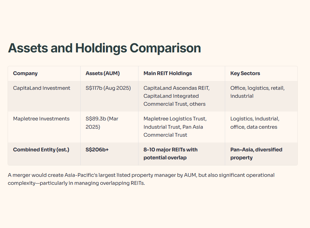 If they merged, you’d have a combined entity with S$206 billion in assets, significant overlap across REITs and property sectors, and the ability to operate at a scale few real estate firms in the Asia-Pacific can match. The cost savings alone would be substantial. But merging is never as clean as the PowerPoint slides suggest.