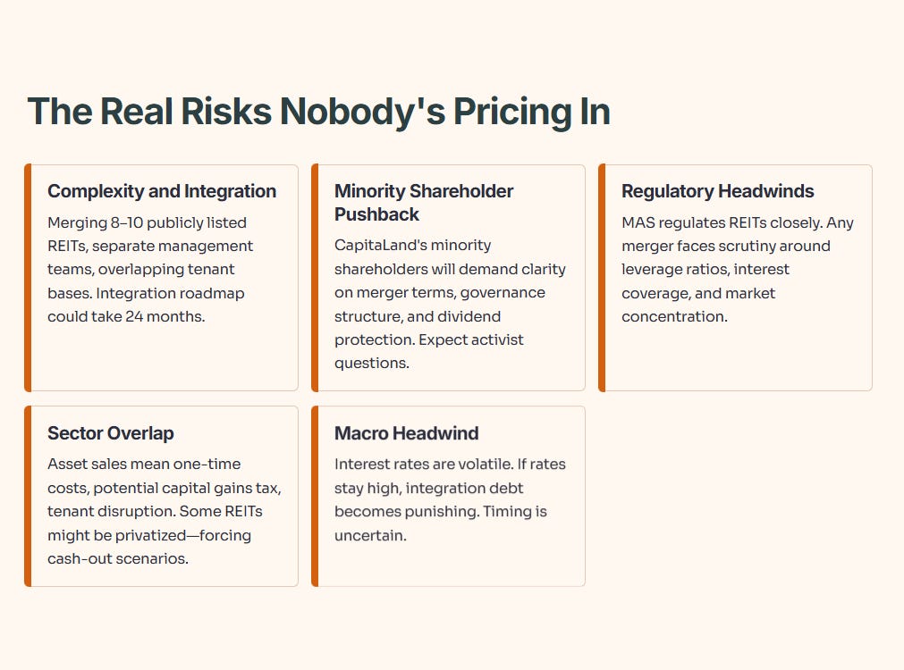 The Bear Case: Integration is messy. During the merger year and the two years after, management gets distracted. You see asset sales to fund the deal, dividend holds to preserve balance sheet strength, and unexpected costs. Look at past major Singapore M&A in real estate—even successful deals often involve distribution freezes or modest cuts in the first 18–24 months.