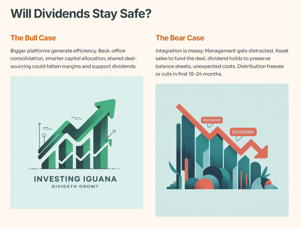 The Bull Case: Bigger platforms generate efficiency. Back-office consolidation, smarter capital allocation, shared deal-sourcing—these could fatten margins and support dividends. History shows that well-executed property mergers sometimes boost payout stability by reducing costs and improving asset utilization.