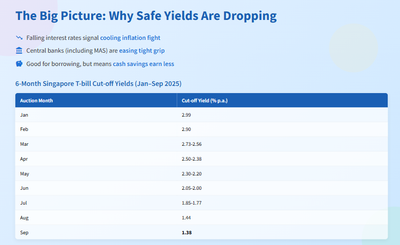 This table tracks the decline in 6-month Singapore T-bill yields at each auction in 2025. It shows how rates have fallen from nearly 3% early this year to just 1.38% in September, underscoring why yield-seeking investors must revisit familiar strategies now.
